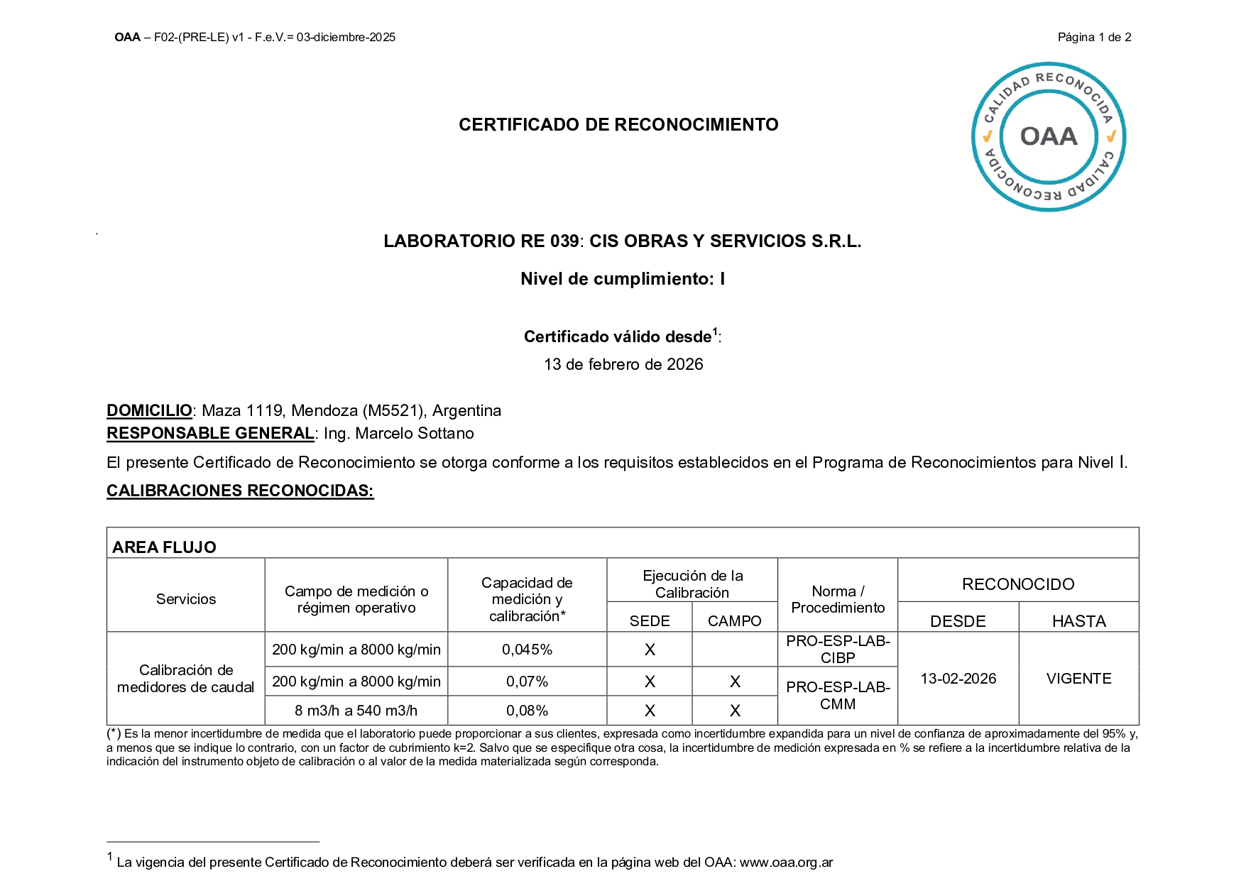 Nuestro laboratorio es ahora una entidad reconocida por el Organismo Argentino de Acreditación (OAA) bajo la denominación RE 039, lo que da la conformidad de nuestro sistema bajo los estándares de la norma ISO/IEC 17025.